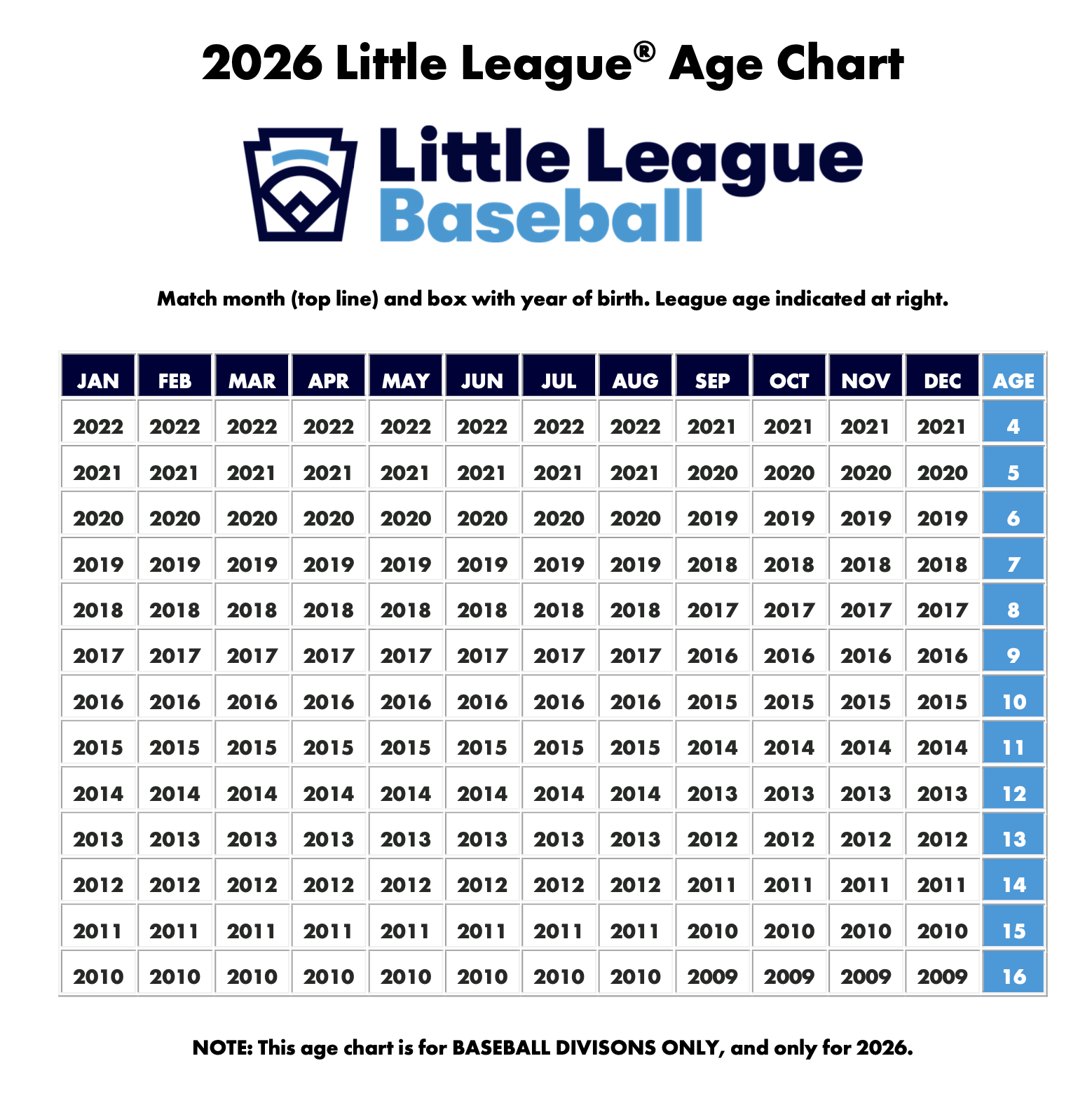 * Starting with the 2025 season, children league age 4 – 7 years will have the ability to register for any Little League program they choose, without respect to any geography- or school-related eligibility requirements. Those players who register under this option will also be fully eligible to participate in all aspects of league play, including International Tournament play, for the duration of their Little League careers provided they have continuous and unbroken participation within the specific league where initially registered and provided all other participation eligibility requirements have been met.